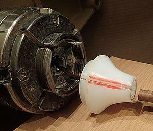 You can mount it in the lathe headsock with a Jacobs Chuck (not a good option), a commercial Collet Chuck with a 1/4" collet or home made Collect Chuck like the one in the photo. Make a collet out of UHMW or hardwood with a 1/4" hole the fits in your 4 Jaw lathe chuck.