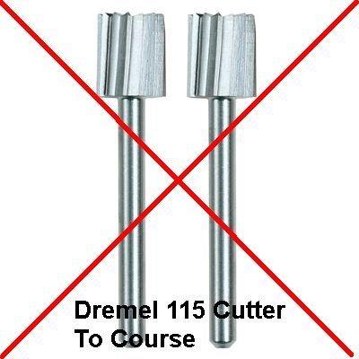 Dremel has a "115 High Speed Cuter" (square cylinder single cut burr) that I DO NOT like because the flutes are to far apart. To course. It makes to much of a mess and is hard to control. Unfortunately, it is commonly available at Home Depot, etc. Avoid it.